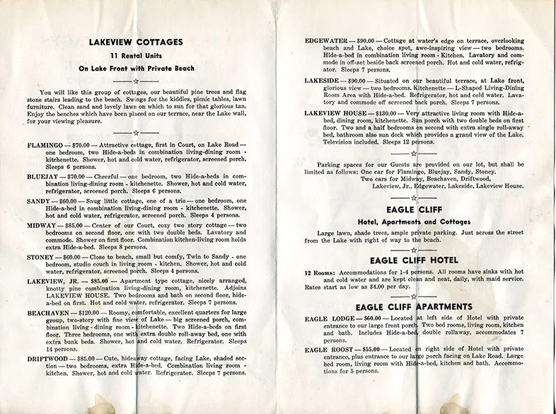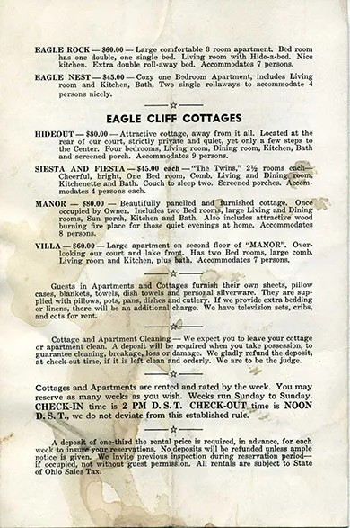 The Eagle Cliff was actually a cluster of accommodations. The Hotel itself had 18 rooms in 1935. There were cottages, as well. The Hideout, at the rear of the court; Siesta and Fiesta, twin cottages each offering 2.5 rooms; the Manor, a paneled cottage that accommodated eight persons; and the Villa. The Hideout, Siesta, and Fiesta are part of the National Register of Historic Places listing. These buildings were moved to the property in the 1930s.