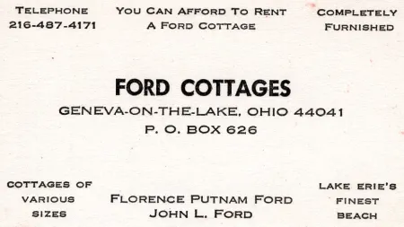 Ford Cottages were built by Florence Putnam Ford and her husband, John, in 1942. They stood along South Putnam Drive, across from the Jennie Munger Gregory Museum and slightly to the west.