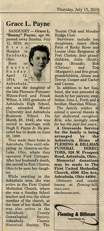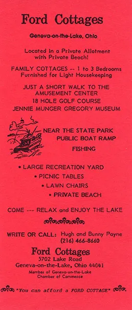 John and Florence ran the cottages from 1942 until their deaths in 1969. Their daughter, Grace (Bunny) Payne, and her husband, Hugh, relocated to the village from Ashtabula to take over the cottage business. They also had many happy times running the cottages until 1999.